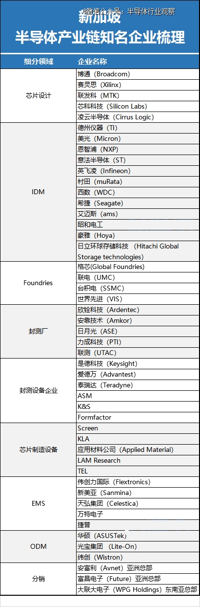 详细来看,在晶圆制造环节,新加坡拥有格罗方德、联电、SSMC等大厂;在装备环节,有ASM、KLA等大型的生产基地,爱德万、泰瑞达、TEL、泛林团体、应用质料等装备厂在新加坡也有较大的区域总部;在封测环节,星科金朋、ASE、Amkor、长电科技等封测重镇均在新加坡有设厂。