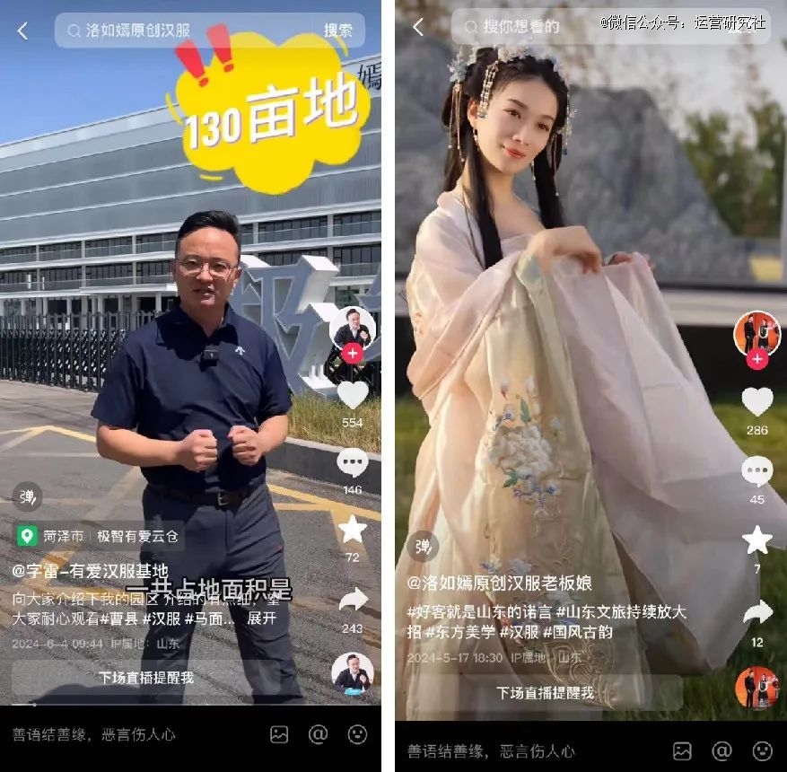 洛如嫣是一对伉俪确立的品牌。在内容种草方面也很有意思,老板娘主要面向 C 端,讲汉服知识和一样平常穿搭,老板面向 B 端,主要先容品牌优势和工厂能力,天下招商。