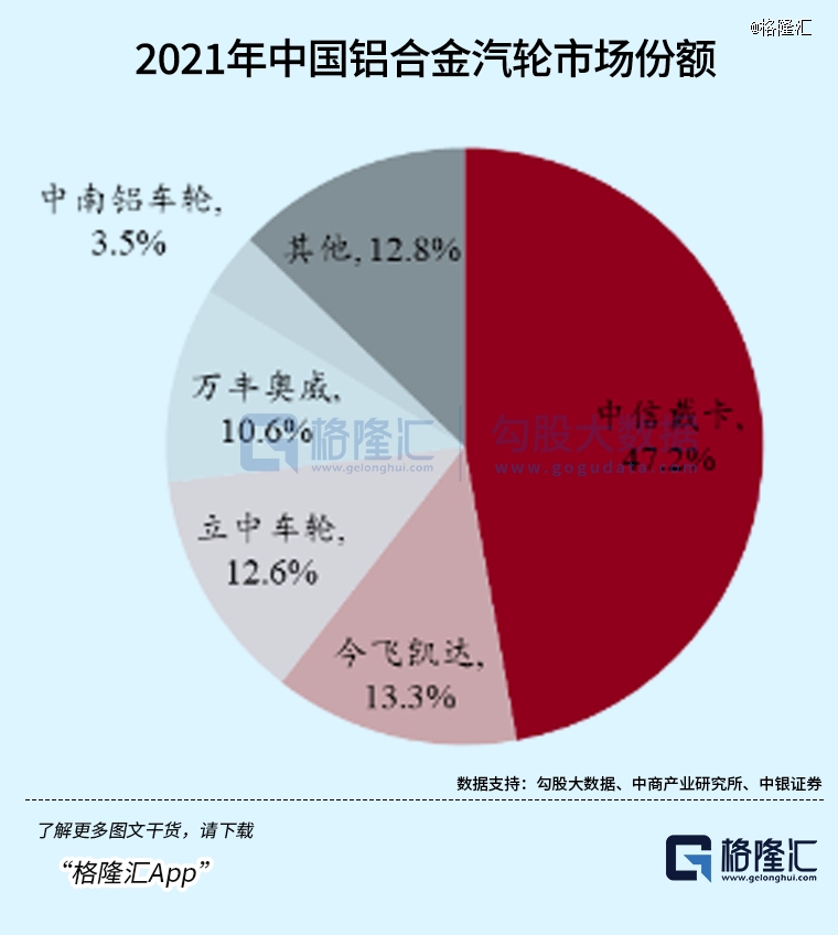铝合金质料在汽轮生产使用中较为普遍成熟,渗透率靠近80%,且市场高度集中,2021年前五大制造商的份额合计87.2%,万丰奥威以10.6%排在第四。
