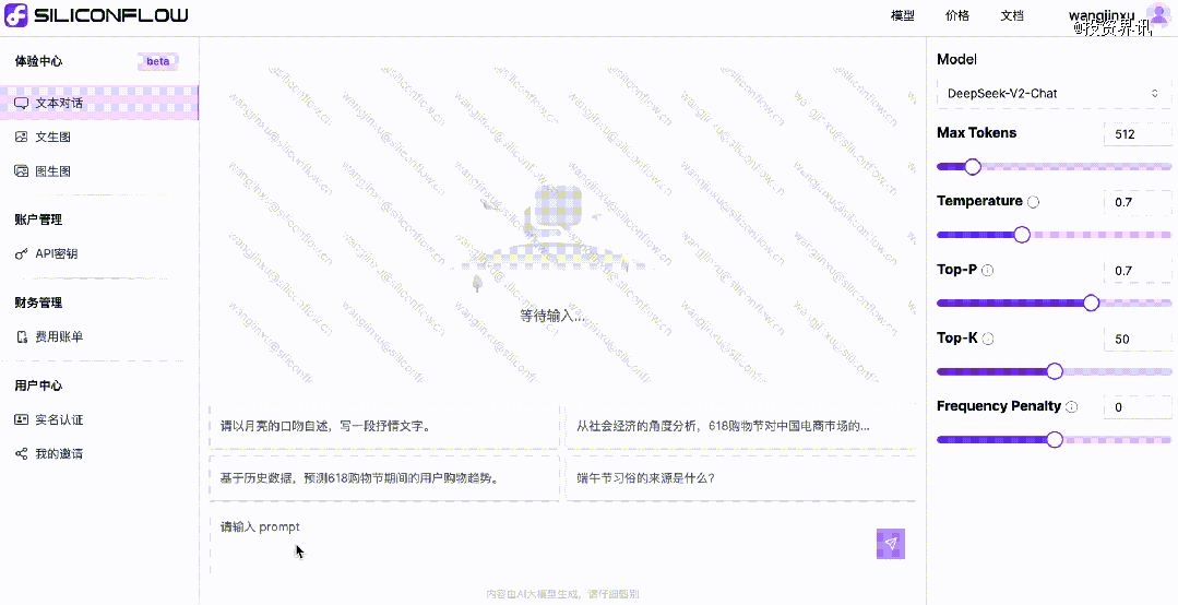 6月,硅基流动正式推出了新产物 —— 一站式大模子API云服务平台SiliconCloud,汇聚了诸多主流大模子,如阿里旗下的通义大模子Qwen2、智谱旗下的GLM-4、幻方量化旗下的DeepSeek V2系列开源模子,以及文生图模子SDXL、SDXL Lightning、PhotoMaker、InstantID等。