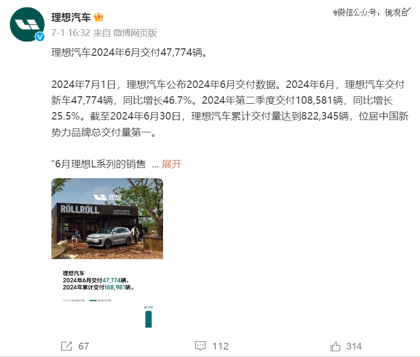 两分钟后,理想宣布了月销47774辆的成就,力压问界的43146辆,再次连任了新势力的月*。理想2024年前半段的总销量来到了188981辆,也高于问界的181197辆。