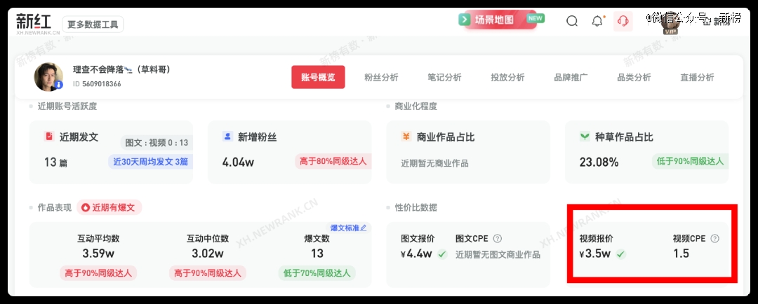 新榜数据显示,他在抖音上平均每个月接3-5条商单,小红书近期没有商单条记,显示的单条视频刊例价为3.5万元。
