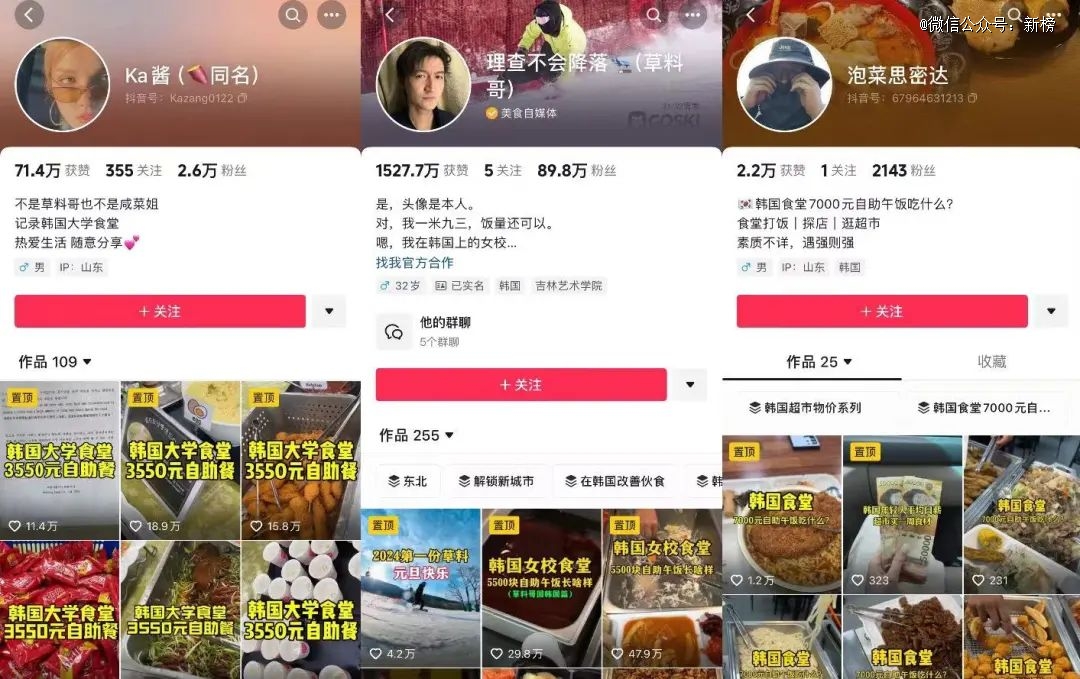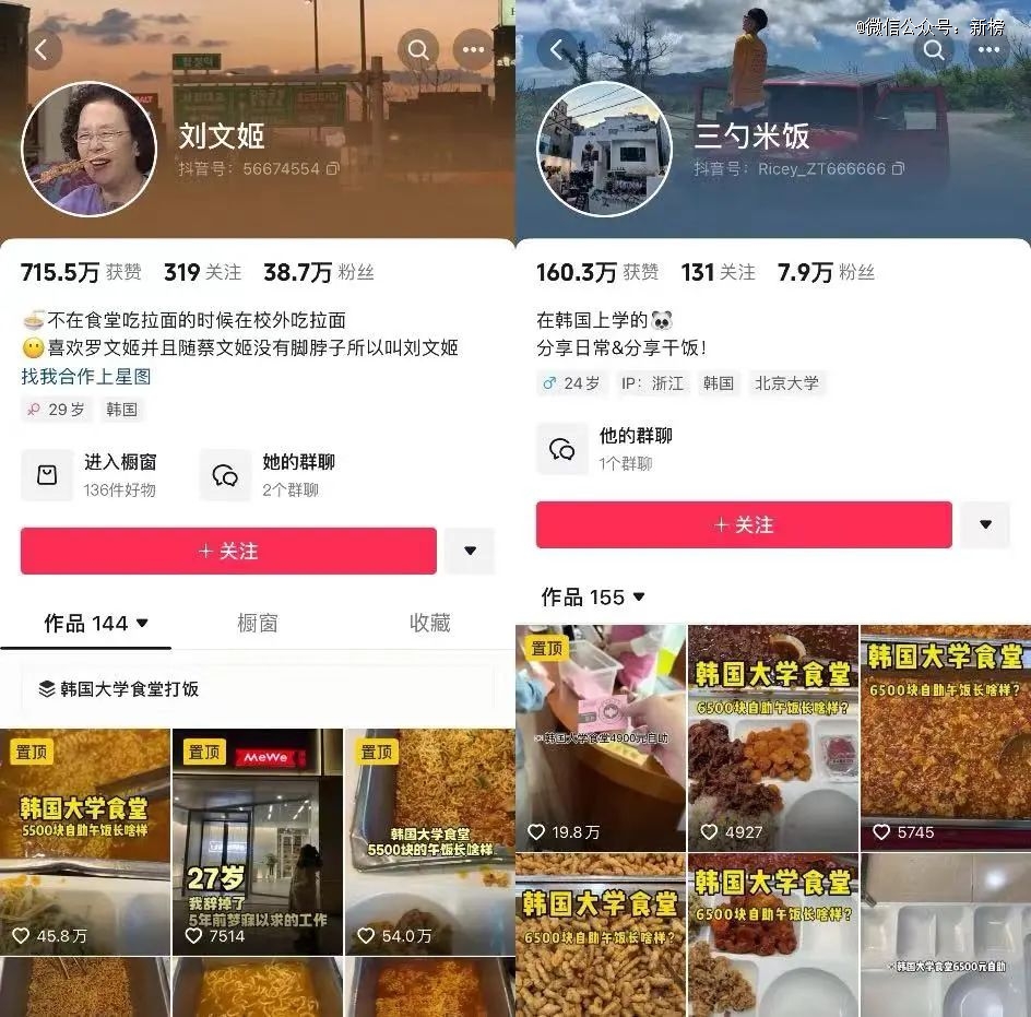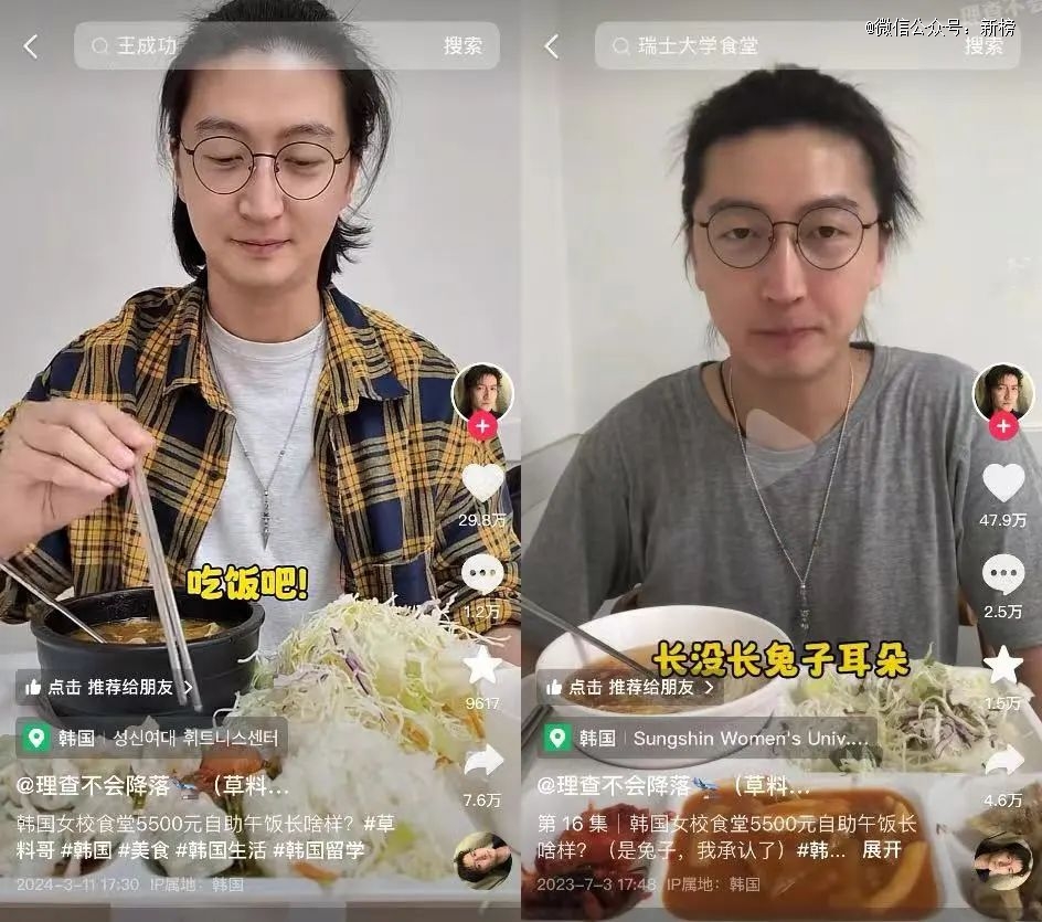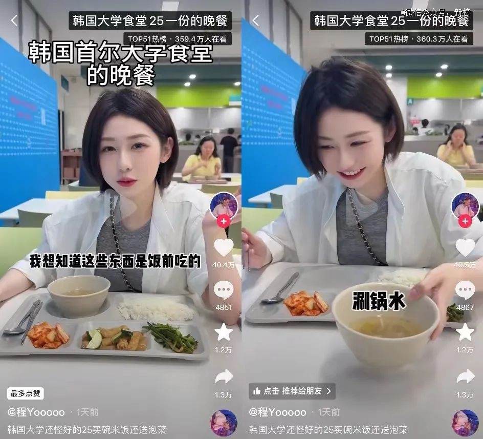 好比“云师傅_”,和“理查不会下降”在统一所韩国女校念书,也追随着草料哥的措施最先在食堂做起了吃播,宣布了多条食堂视频,热度高的抖音点赞破万。