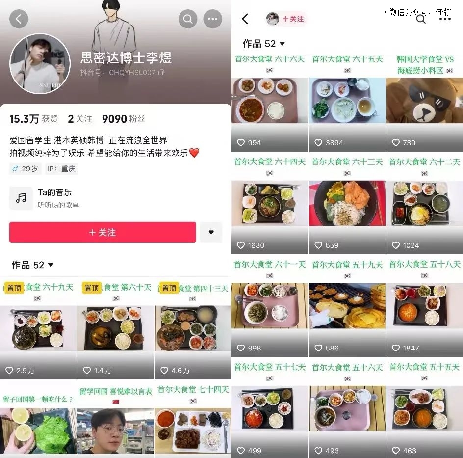 好比“思密达博士李煜”,在首尔大学留学,从今年1月最先运营抖音账号,*条视频就是以“挑战全球大学最差食堂饭菜”为主题拍摄,住手现在宣布了52条视频,每条都是首尔大学食堂相关,现现在已经挑战到第74天,粉丝数积累了近1万。