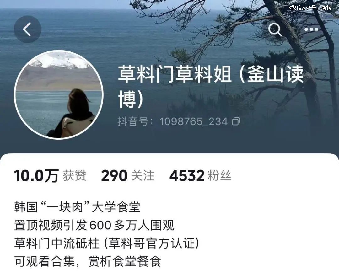 曝光釜庆大学争议通告的“草料门草料姐(釜山读博)”,也是受草料哥的影响最先拍食堂,账号先容中就写着“草料门中流砥柱(草料哥官方认证)”。