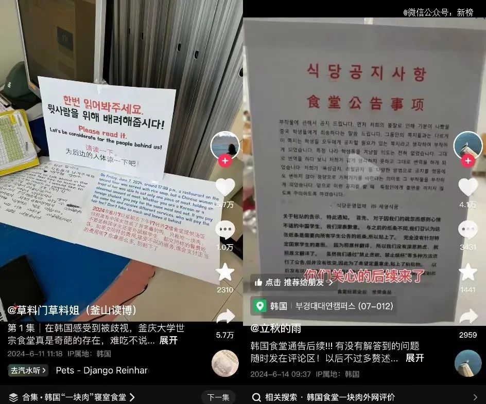 由于在上个月,在韩国留学的“草料门草料姐(釜山读博)”曝光了釜庆大学食堂的一则通告,其中用中文、韩文、英文三种语言严肃指出一位中国女性多拿了限量的肉类,引发全网热议。