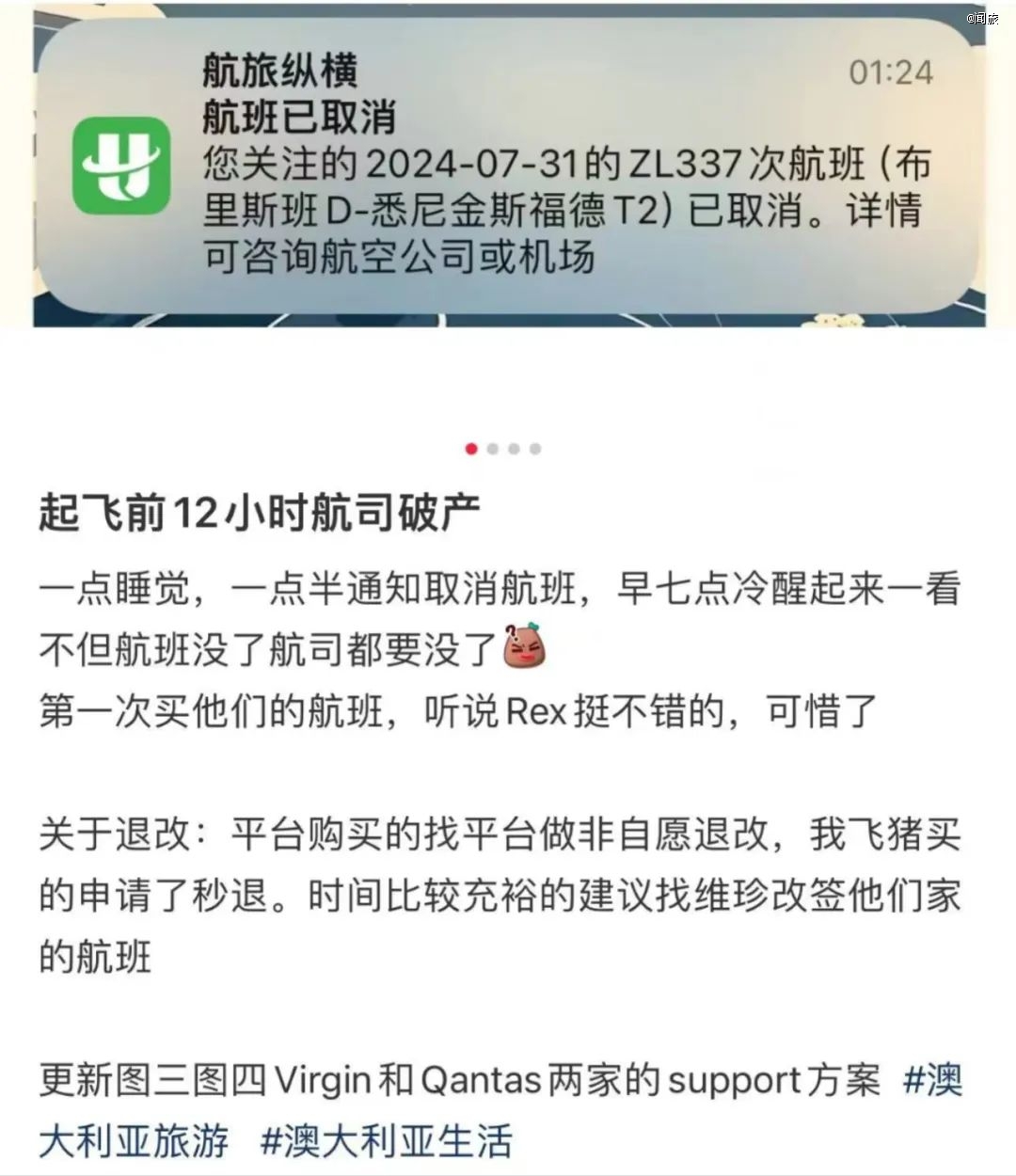 据该网友形貌,其预订了7月31日由布里斯班飞往悉尼的澳大利亚Rex航空公司机票,当地时间破晓一点半接到航班作废信息,早上七点再看详细情形,不仅航班作废了,执飞的航司都要没了。