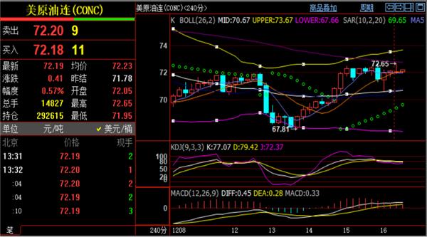 支持方面注重小时线下轨71.5一线,而小时线MA60均线重合4小时MA5均线位于71.3位置,这会是今日油价的第一个防守区域。4小时布林带中轨与MA60均线、SAR停损转向指标麋集支持局限在70.8-70.6区域,更下方支持就是70关口以及69关口。刘铭诚提醒现在小时线布林带三轨与小时线尺度误差带三轨基本粘合,日内关注72.7-71.5区间的破位情形再定后续计谋。整体来看日线MACD绿色动能柱缩量,但周线MACD指标却处于放量阶段,对于周初油价暂定70-74箱体内运行,短线思绪维持高空稳固。日内操作上刘铭诚建议触及触及71.5-71.3区域做多,破70.9止损,目的看72.1-72.7;空单参考73.0-73.4区域建仓,止损73.8,目的72.2-71.5,下破持有;