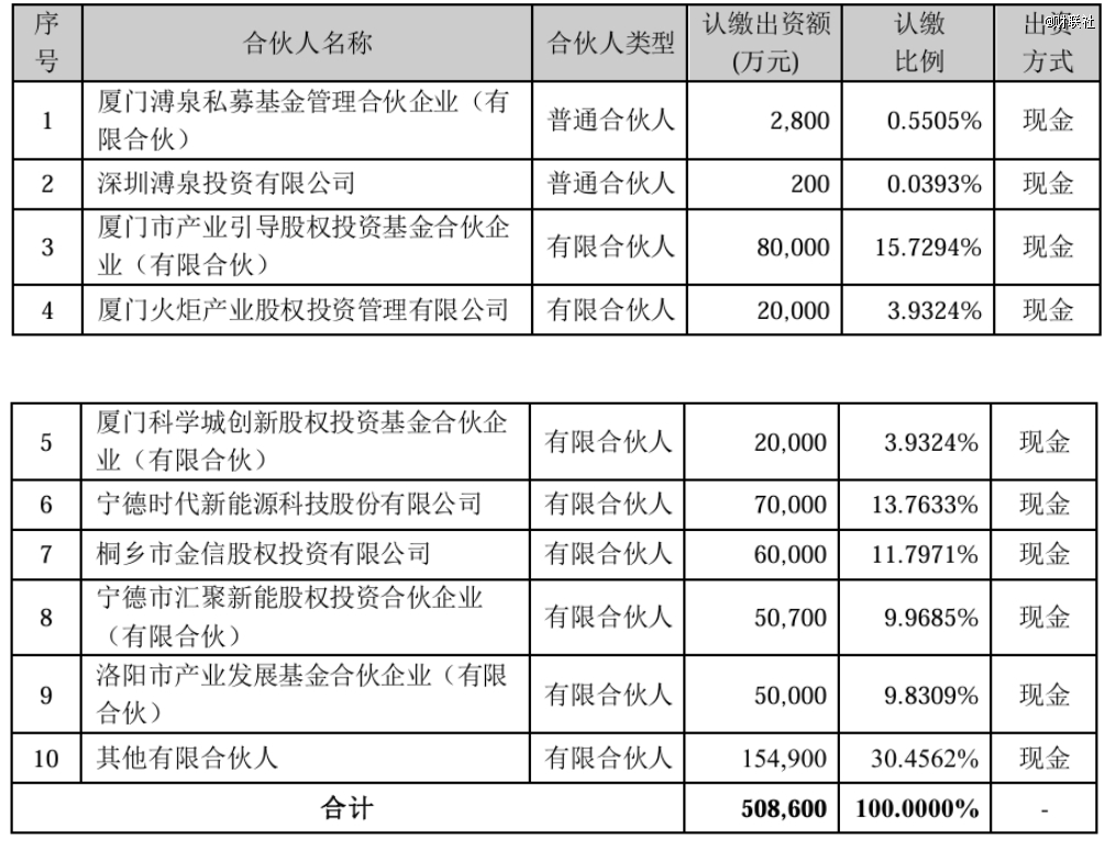 合伙人协议显示,该基金规模超50亿元,由厦门溥泉私募、深圳溥泉投资作为GP,管理该只基金。股权穿透显示,宁德时代新能源产业投资直接持有厦门溥泉私募45%的股权,而另一GP深圳溥泉投,为厦门溥泉私募子公司。