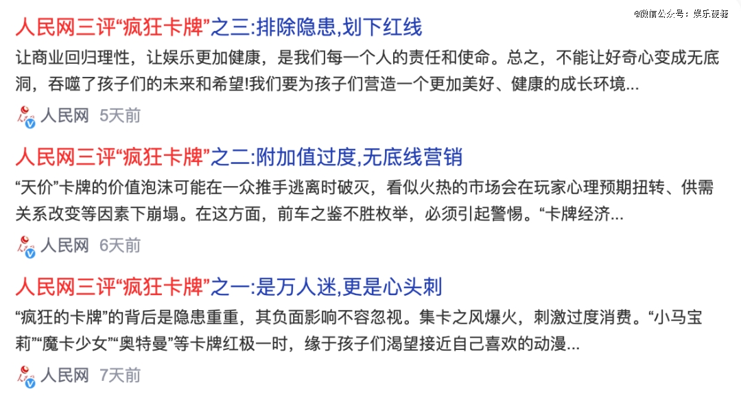 卡牌的好日子怕是要到头了。较之早前报道对小马宝莉卡、奥特曼卡乃至烟卡的猎奇围观或产业分析,近期的官媒定调变成了——“疯狂”。