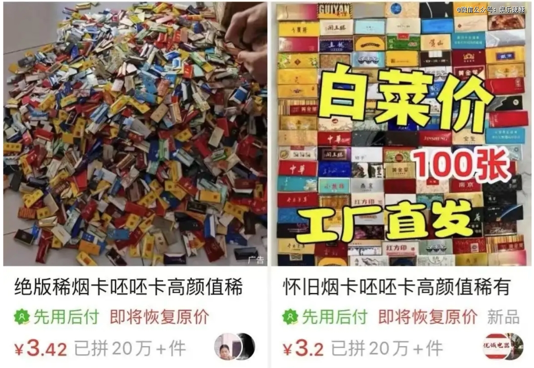 但商业烟卡的出现,一定程度上削弱了“赵长生们”的优越感。首先,他们辛苦收藏、赢取的稀有卡片变得不再珍贵,这些都能在电商平台轻松购得。十几块钱就能买一百张,什么款式都有,很多店铺的拼单量多达几百万件。