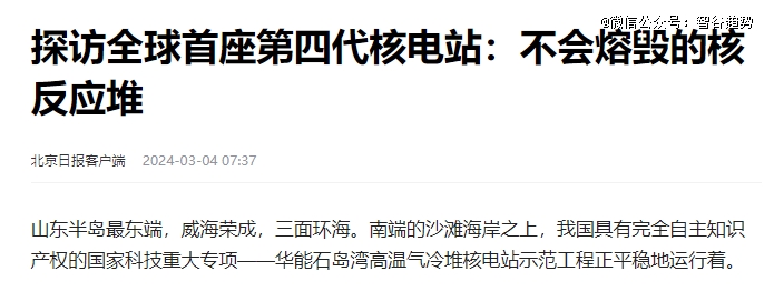 在山东半岛最东端,平稳运行着的华能石岛湾高温气冷堆核电站示范工程,就是全球首座第四代核电站,也被称为“不会熔毁的核反应堆”。