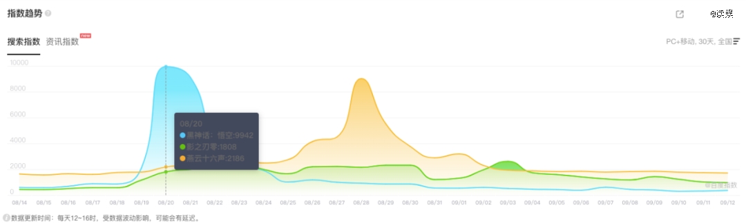 仅以百度指数来参考,在8月20日《黑神话:悟空》发售前,《影之刃零》的百度搜索指数一直在400-500左右,8月20日《影之刃零》的搜索指数直接上升到了1800,此后一个月内最高达到2500左右,比发售前翻了五倍;而《燕云十六声》《失落之魂》《昭和米国物语》等一批国产游戏的百度指数,也都至少在8月20日后比之前增长了三、四倍。