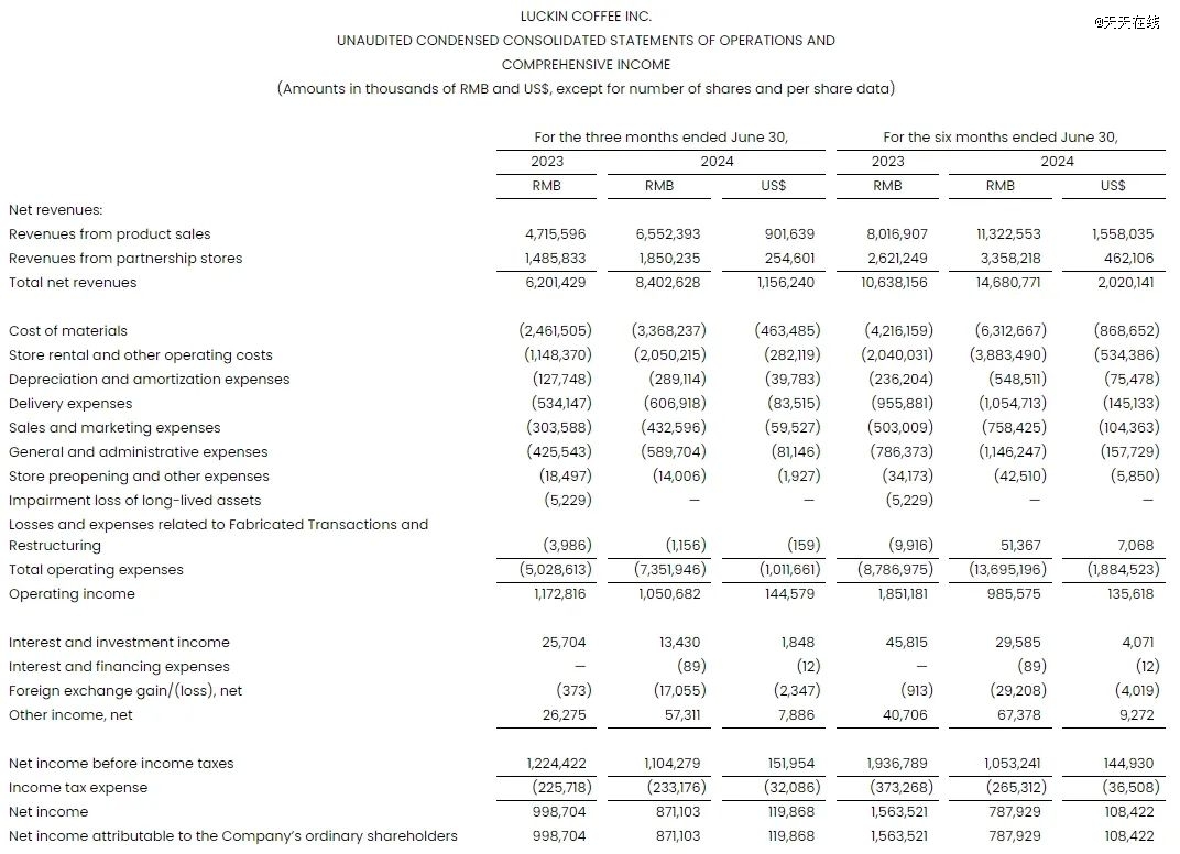 支出方面,财报显示,2024年第二季度,瑞幸咖啡总运营用度为73.52亿元,同比增进46.2%。运营用度占净收入的比例从2023年同期的81.1%上升至2024年第二季度的87.5%,这主要是由于店肆租金和其他运营成本以及质料成本占净收入的比例增添,而公司产物平均销售价钱下降所致。