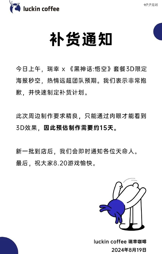 对此,瑞幸咖啡在微信民众号宣布通知称,已就瑞幸x《黑神话:悟空》套餐3D限制海报制订补货设计,由于此次周边制作要求优良,只能通过肉眼才气看到3D效果,因此预估制作需要约15天。