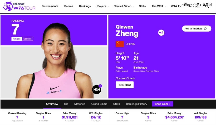 “火箭少女”现在的最高排名是单打第7。(图/WTA官网)