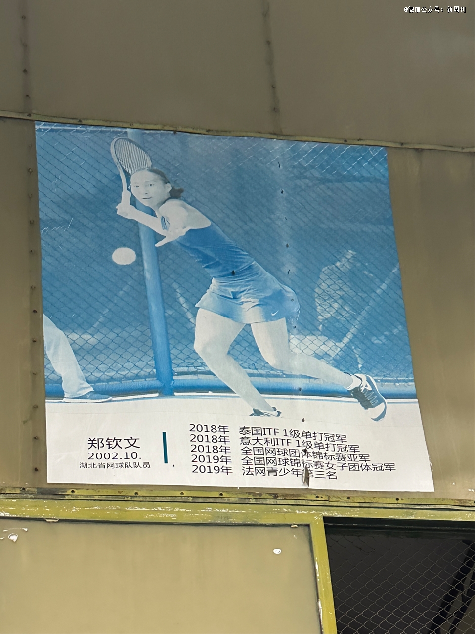 在十堰体育中央的外墙上,郑钦文的海报已经有些褪色。(图/张蔚婷摄)