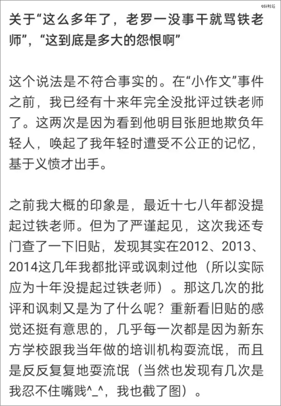 有意思的是,对于“铁先生”被评价为“最没原则的人”,罗永浩在克日长文中注释称源于新东方内部撒播的说法,并枚举新东方对西席治理的容忍例子。他在长文中提到,俞敏洪的支持者不要再激怒他,否则将公然更多猛料。