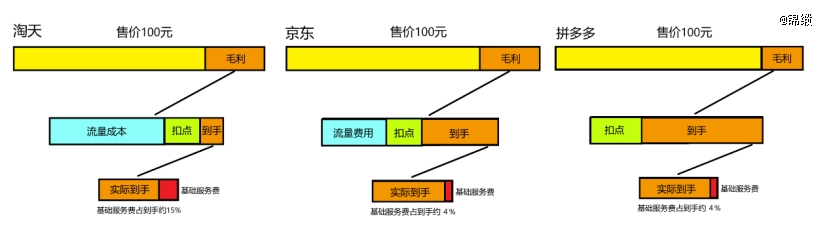 同样是100元的商品,若是淘天京东毛利为30元,拼多多为20元,那么淘天、京东、拼多多扣除综合服务费扣点、流量成本后的得手利润划分为4元、15元和15元。
