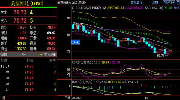 支持方面注意小时线布林带下轨69一线以及昨夜美盘起涨点68.7.4小时下轨与日线布林带下轨重合位于67.8位置。整体来看市场买盘强劲支持油价,但手艺面大周期指标依然处于空头状态,原油再次暴跌洗盘也存在较大几概率。综合来看日线短线关注小时线上下轨70.2-69区间运行,上下破位看行情延续。若油价上破70.9.回撤3-5个点追多看涨本周高点。操作上刘铭诚建议反弹做空为主,低多为辅。