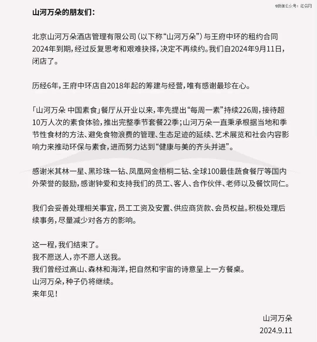 最近一个倒下的米其林餐厅,正是文章开头提到的山河万朵。在官方公告中,山河万朵中强调闭店是因为租约到期,还在最后留下“来年见”的承诺。不过对于将在何时、何地重开,山河万朵并未给出明确答案,其未来依旧充满不确定性。