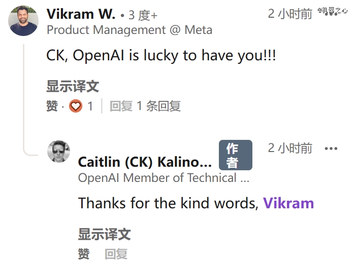 在刚刚官宣新动向后,Kalinowski 一众前同事发来祝贺,言语中都透漏出 Kalinowski 的加入,对 OpenAI 来说真的很幸运。