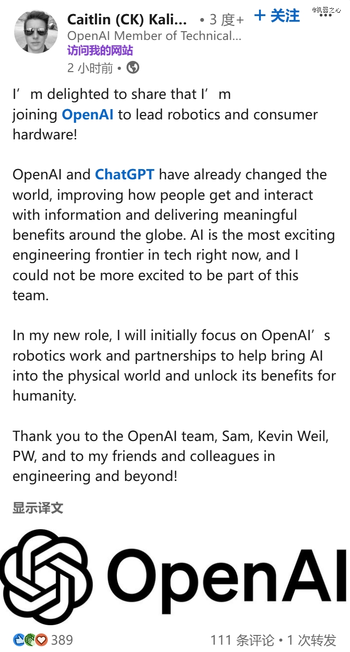 刚刚,Kalinowski 在领英上写道:「非常高兴地告诉大家我将加入 OpenAI,领导机器人和消费类硬件业务!