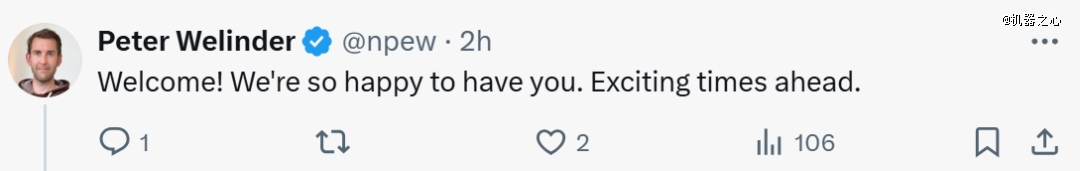 OpenAI 产品副总裁 Peter Welinder 表示:非常高兴 Kalinowski 的加入。