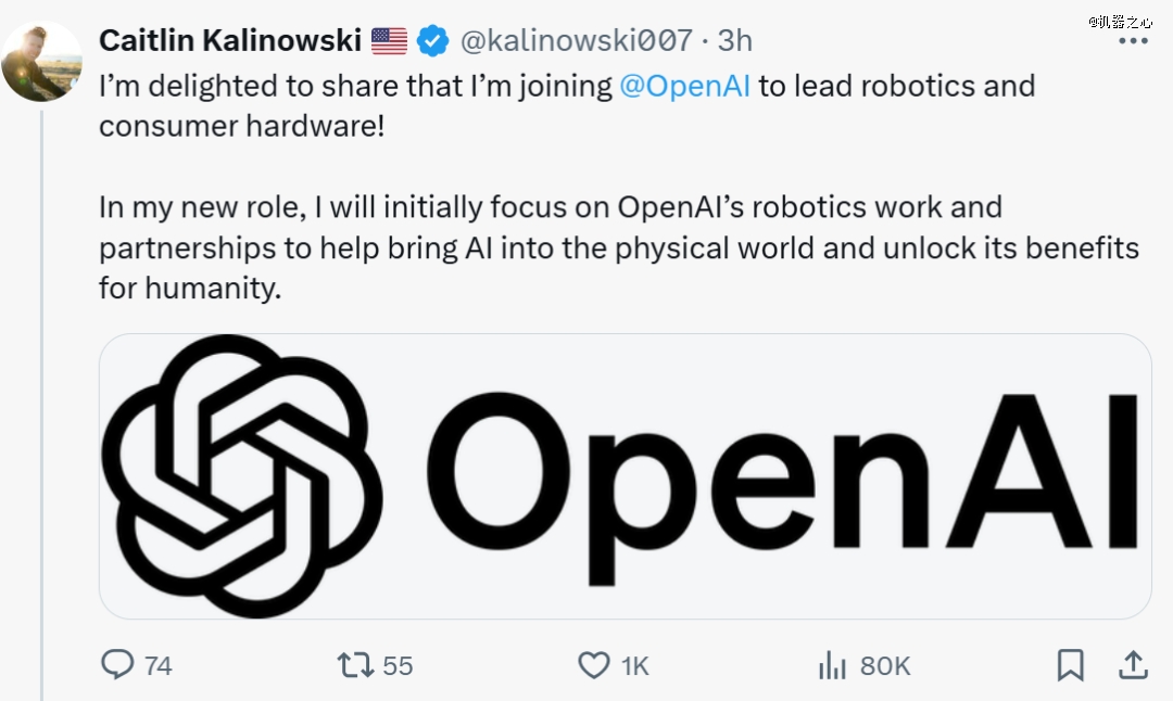 新加入的 Kalinowski 工作重心是机器人和消费硬件业务,或许我们可以期待一下 OpenAI 在硬件方面带来 ChatGPT 时刻。