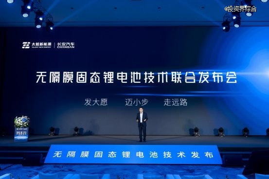 2024年11月7日,太蓝新能源与长安汽车在重庆联合举办无隔膜固态锂电池技术发布会。双方联合推出无隔膜固态锂电池技术,该项技术通过中国轻工业联合会科技成果评价鉴定,达到“国际先进”水平。会上,太蓝新能源、长安汽车、中关村新型电池技术创新联盟、真锂研究还共同发布行业首部《固态锂电池技术发展白皮书》。