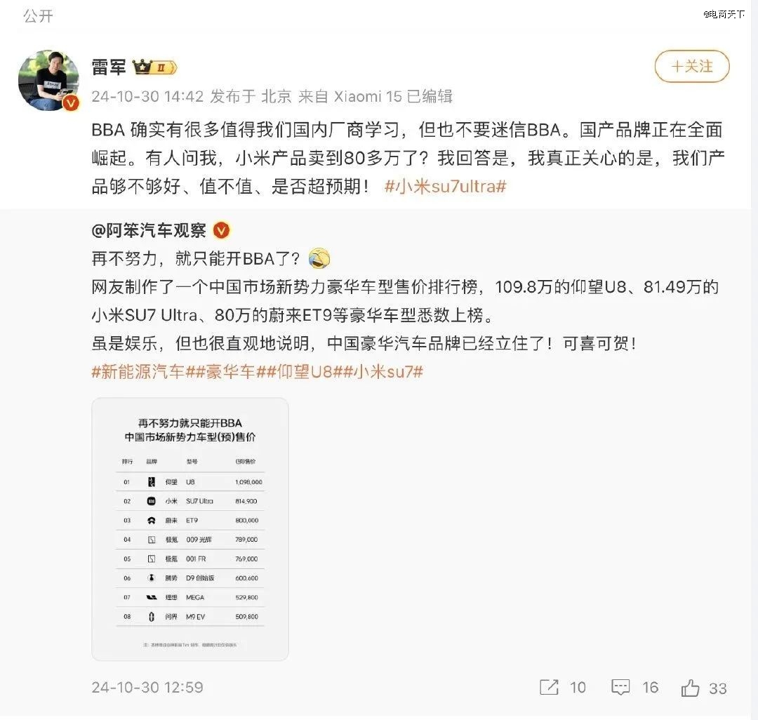 对此,雷军回应道:“BBA 确实有很多值得我们国内厂商学习,但也不要迷信BBA。国产品牌正在全面崛起。有人问我,小米产品卖到80多万了?我回答是,我真正关心的是,我们产品够不够好、值不值、是否超预期!”