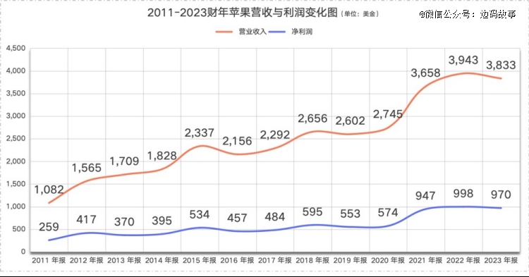 乔布斯去世后,十二年间,苹果的营收从1082亿美金增长到了3833亿美金,增幅三倍;利润则从259亿美金,增长到了970亿美金,增幅近四倍。