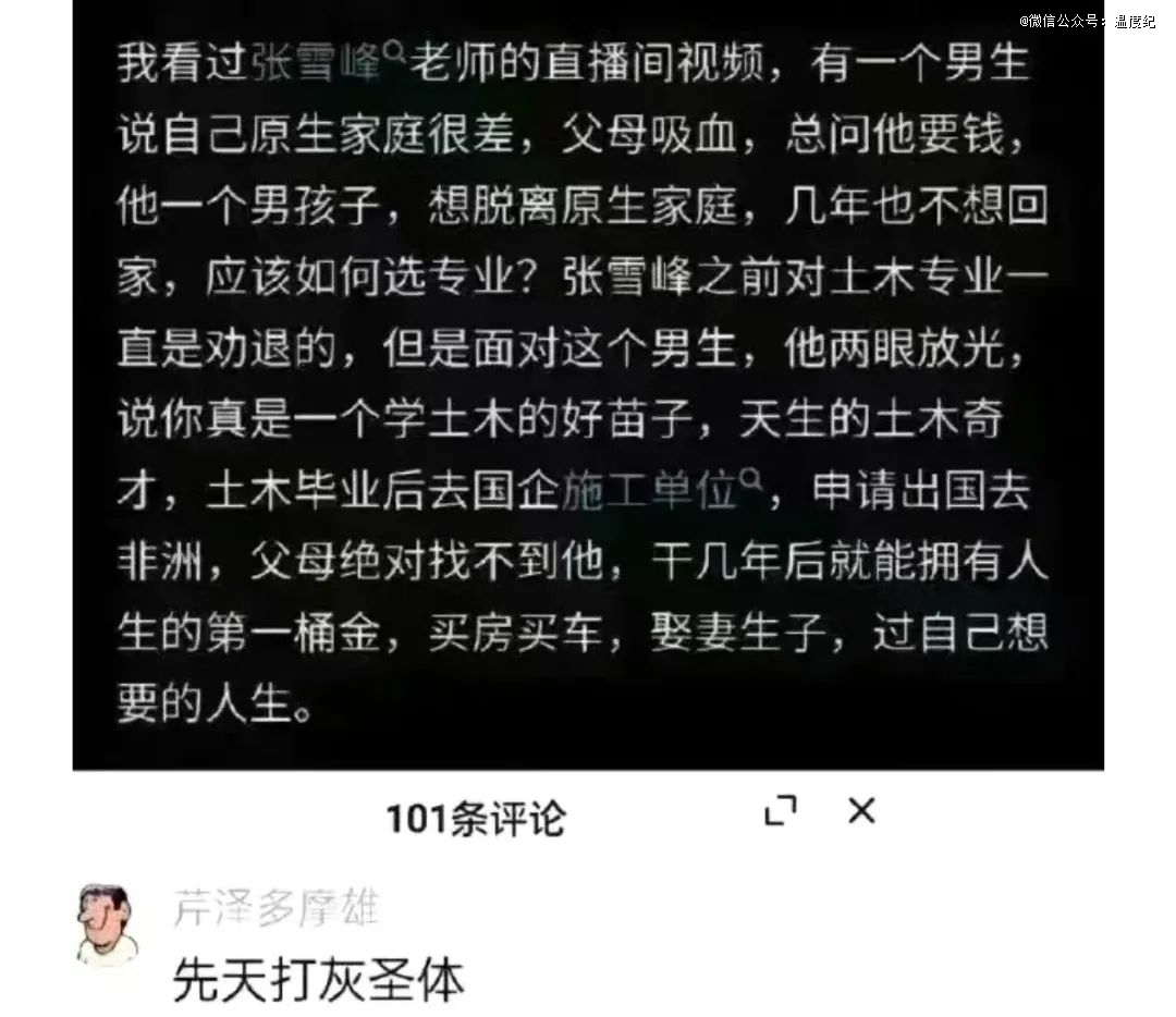 张雪峰直播间里还存在更为纯净的“圣体”:在以上条件全部满足的情况下,再加上父母吸血,自己想要逃离原生家庭。