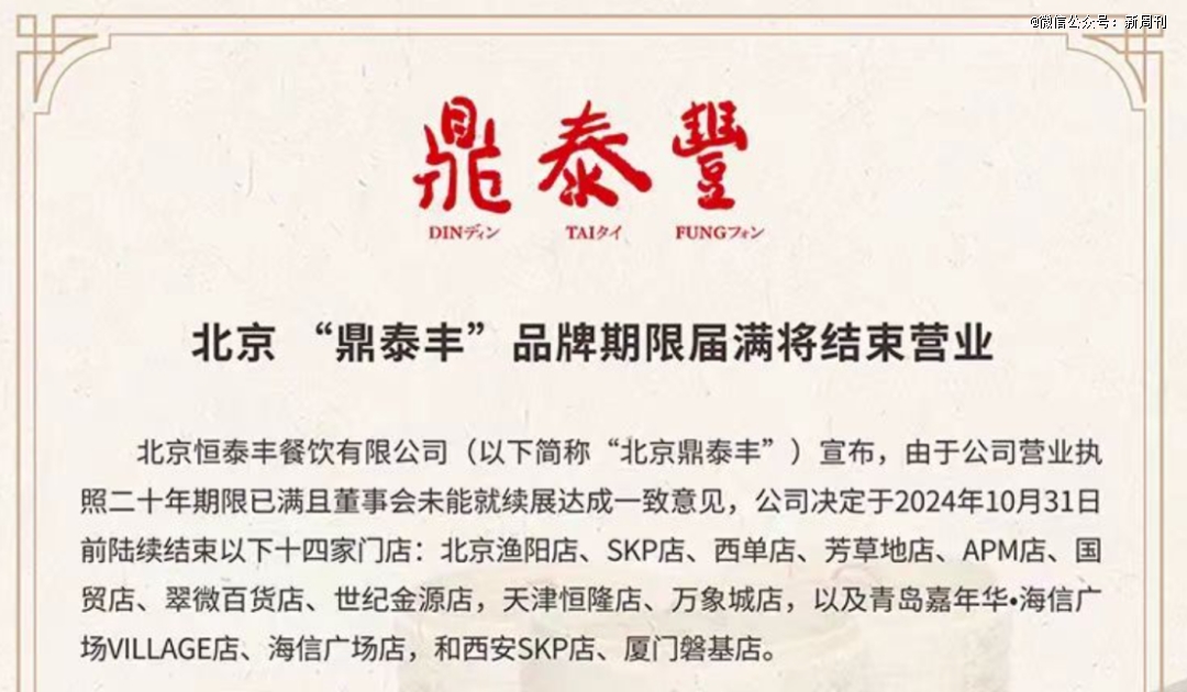 鼎泰丰闭店声明。(图/鼎泰丰微信公众号)