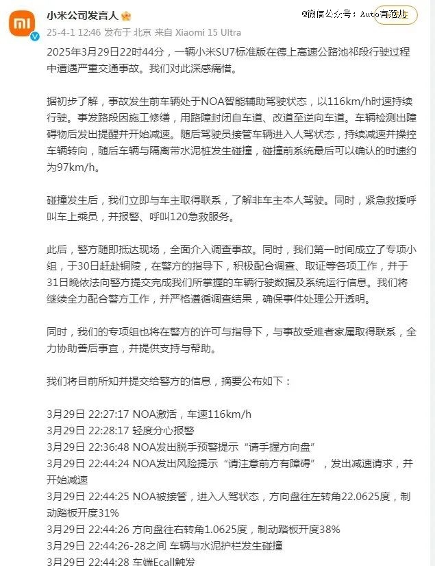 很快在4月1日午间,小米公司发言人公布了事发时的车辆行驶数据,并对事件做出回应:“3月29日22时44分,一辆小米SU7标准版,在德上高速公路池祁段行驶过程中遭遇严重交通事故。我们对此深感痛惜”。