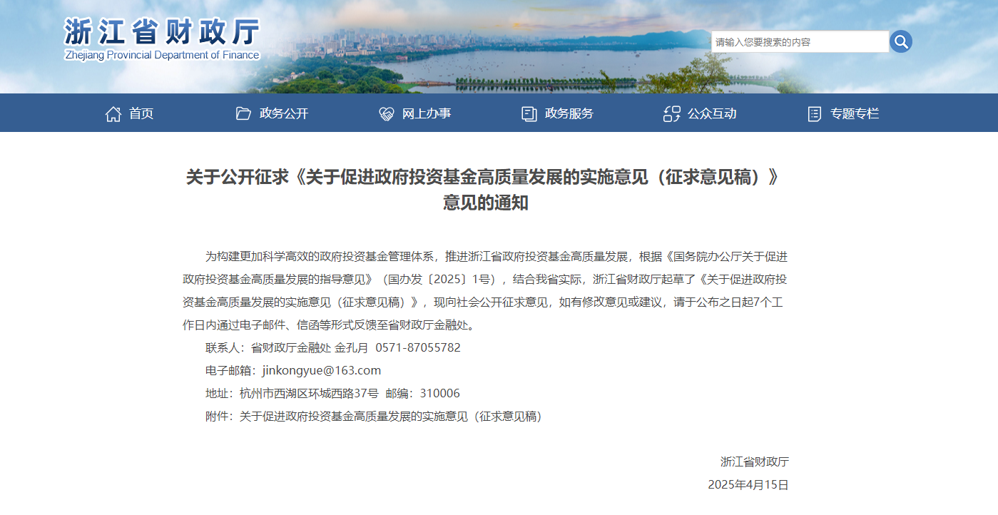 消息,近日,浙江省财政厅发布了《关于促进政府投资基金高质量发展的实施意见(征求意见稿)》,旨在推动政府投资基金科学高效发展,构建更加规范、高效的政府投资基金管理体系,以支持浙江省现代化产业体系的完善和重大战略实施。该文件明确了政府投资基金的分类、管理原则及运作方式,并提出了若干具体措施,如加强投资引导、优化基金结构、健全激励约束机制等。