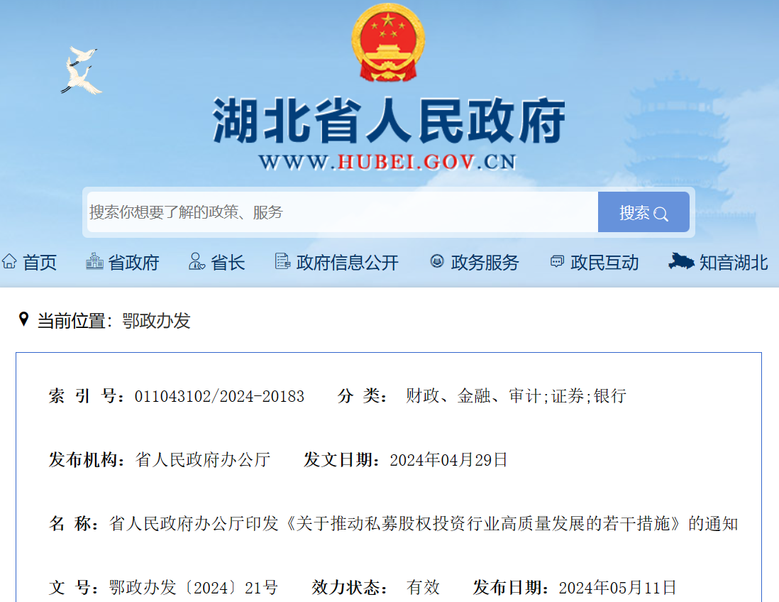 新闻,克日,湖北省人民政府办公厅印发《关于推动私募股权投资行业高质量生长的若干措施》的通知,出资方面值得关注——确立省市县联念头制,根据市场化原则相互参股基金,省政府投资基金对区域分母基金的认缴出资比例上限提高为25%,省内财政及国资出资比例上限提高到90%,减轻市县政府出资压力,降低社会资源募资难度。