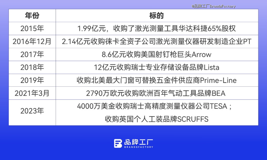仇建平对外洋手工具品牌的收并购始于2017年。现在诸多营业都来自并购,包罗存储箱柜、动力工具、激光丈量仪、储能工具等。