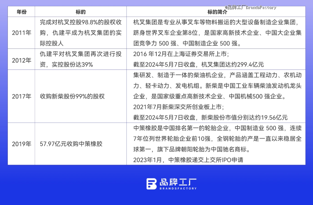 而这样的操作不仅仅局限在原有营业的纵深。进入资源市场后,仇建平一再脱手,将众多优质资产收至麾下,事业疆土横向拓至叉车、轮胎、机械人、柴油发念头等多个领域。