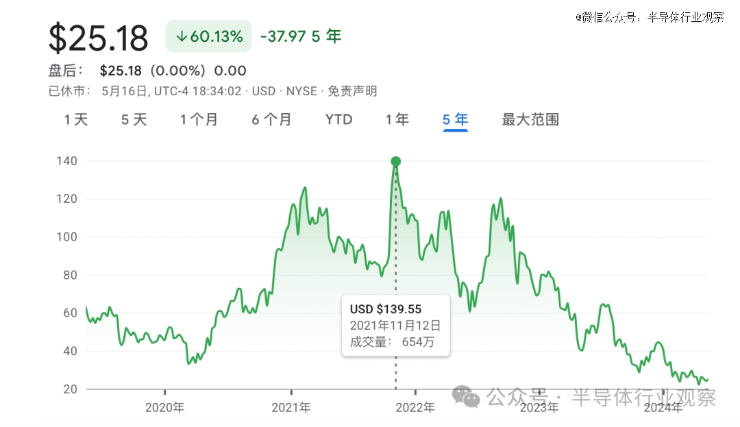 手握全球六成SiC衬底质料供应,是*家大型的8英寸SiC晶圆厂,也是*一家纯粹的垂直一体化SiC公司,在新能源汽车对 SiC 质料需求兴旺的情形下,Wolfspeed 本应是一家光泽万丈的公司。然而,Wolfspeed 的股价却从 2021 年 11 月的峰值 139 美元暴跌至 2024 年 5 月的 25 美元,跌幅高达 82%,股价与市园职位严重不符。