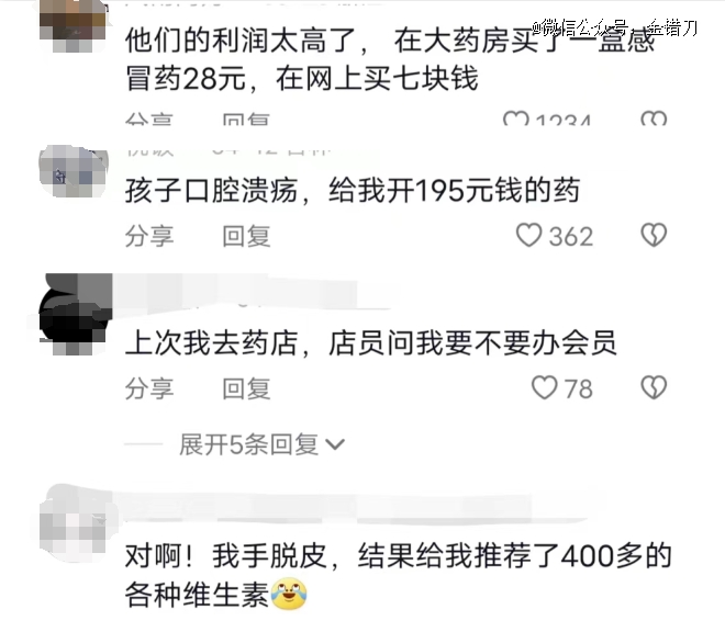 “药店开得这么多,药价却未廉价”“药店药卖得贵,利润一定很高”“线下比线上伤风药贵一倍”。